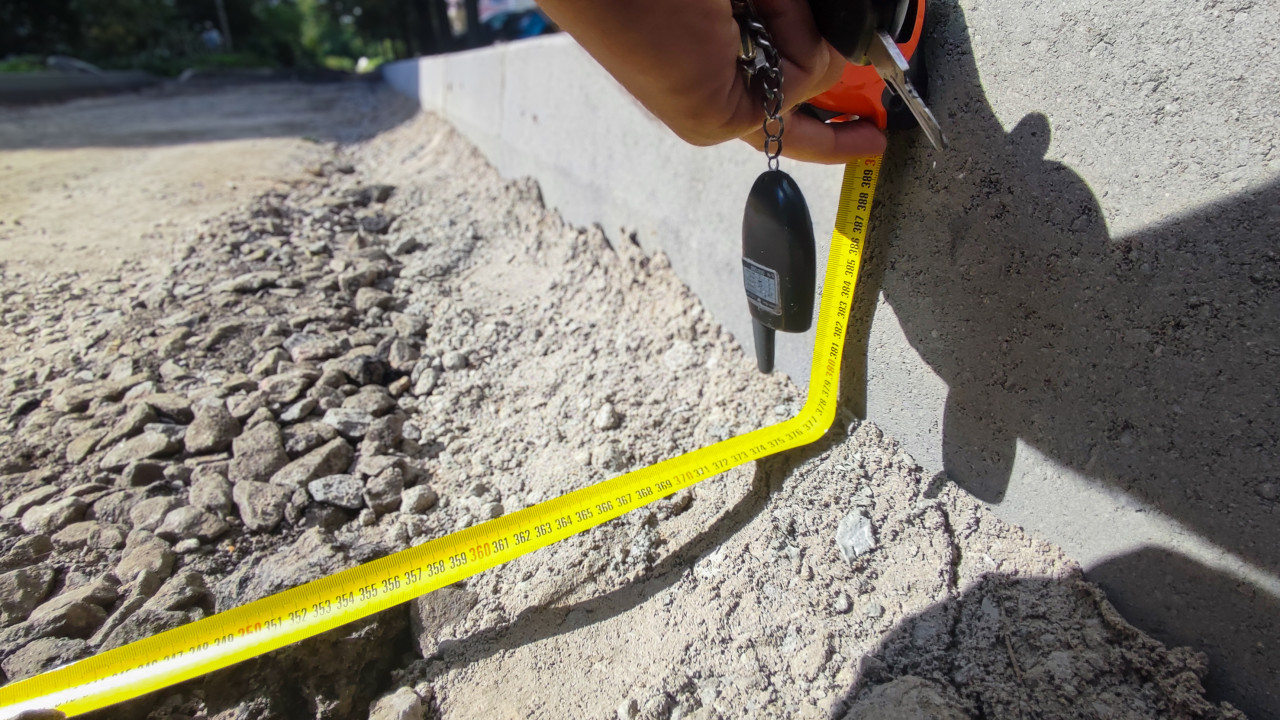 Замер глубины основания у бордюрного камня строительной рулеткой на участке дорожных работ