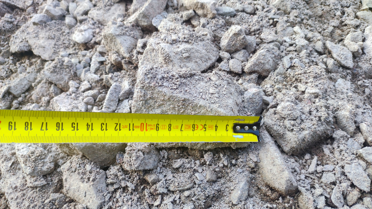 Рулетка разложена на строительном грунте с каменной крошкой и обломками бетона; шкала показывает измерение крупного фрагмента в насыпи. Вокруг видны неровные куски разного размера, пыль и мелкий песок, освещение ровное, дневное. Сцена подходит для иллюстрации контроля размеров заполнителя, когда на объекте проверяют фракцию щебня или остатки старого основания перед укладкой нового слоя. Фото можно применять в материалах о дорожных работах, техническом надзоре, сметах и закупке инертных материалов.