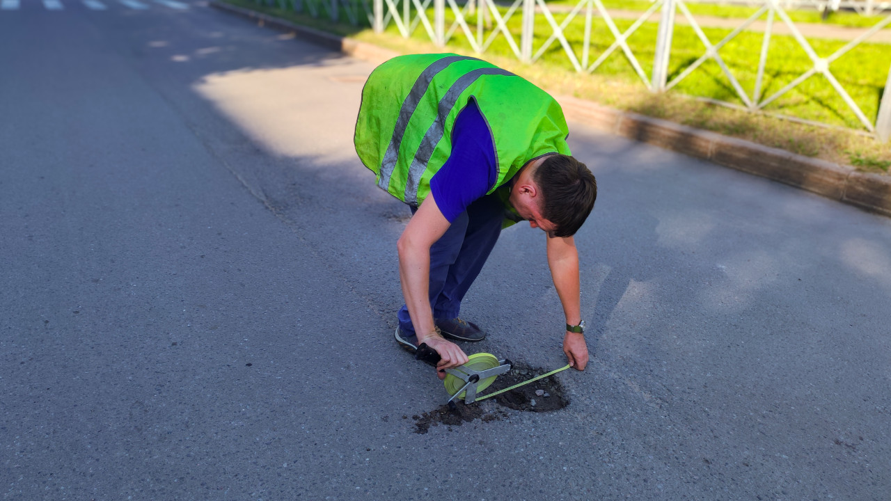 Дорожник меряет выбоину рулеткой прямо на проезжей части