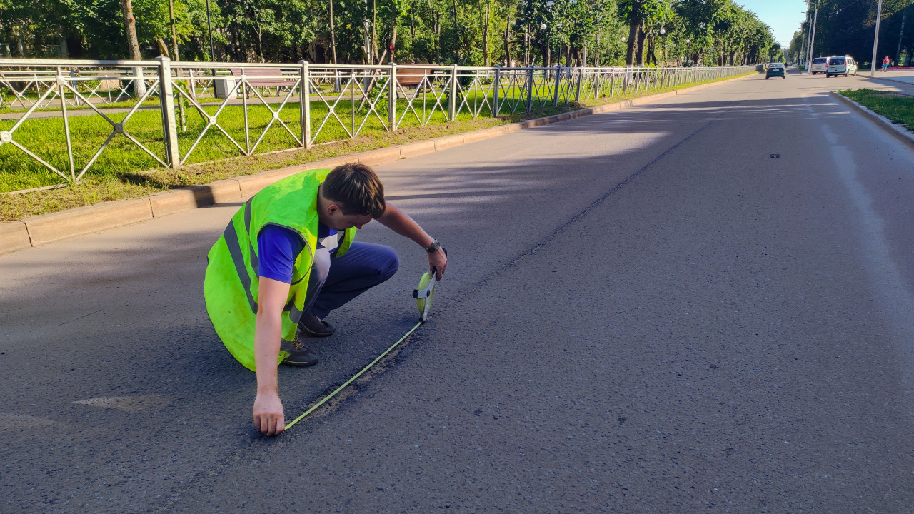 рулетка линейка измерение размеры сантиметры измерения измерительные работы обмеры замеры исследование качество контроль контроль качества проверка качества оценка качества экспертиза строительный контроль технический контроль технадзор строительный надзор технический надзор дорога асфальт дорожное покрытие дефект трещина шов просадка неровность повреждение крошка асфальта износ обследование диагностика замер измерительная лента дорожник рабочий светоотражающий жилет ремонт дороги дорожные работы бордюр тротуар тени городская инфраструктураПохожие фотографии