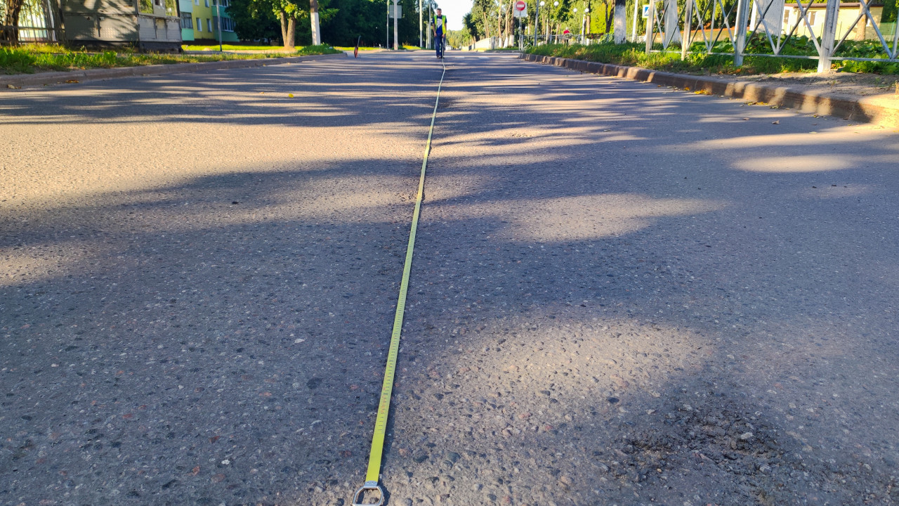 рулетка линейка измерение размеры сантиметры измерения измерительные работы обмеры замеры исследование качество контроль контроль качества проверка качества оценка качества экспертиза строительный контроль технический контроль технадзор строительный надзор технический надзор измерительная лента кольцо замер полевые работы инженерный контроль дорога асфальт бордюр газон забор деревья тени заплатки швы дорожные знаки провода автомобили городская улица жилой район дорожные обследования диагностика покрытия ремонт инспектор сигнальный жилетПохожие фотографии
