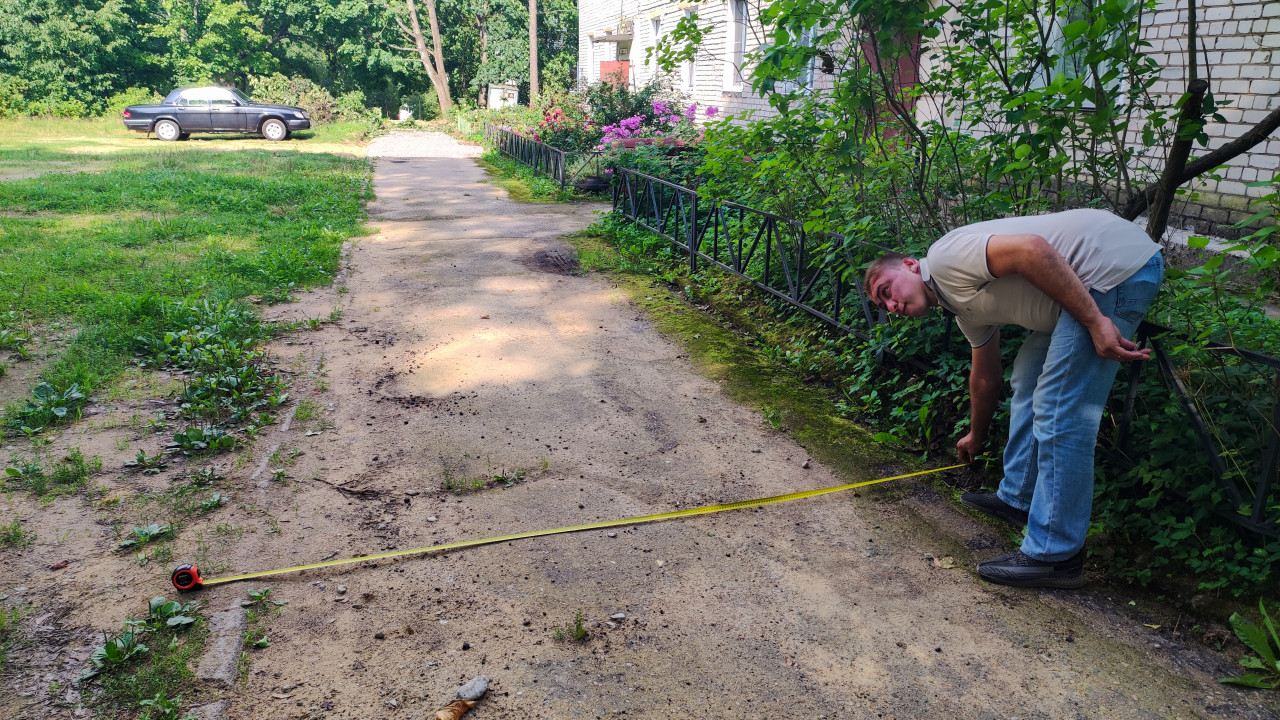 Измерение ширины пешеходной дорожки рулеткой во дворе жилого дома