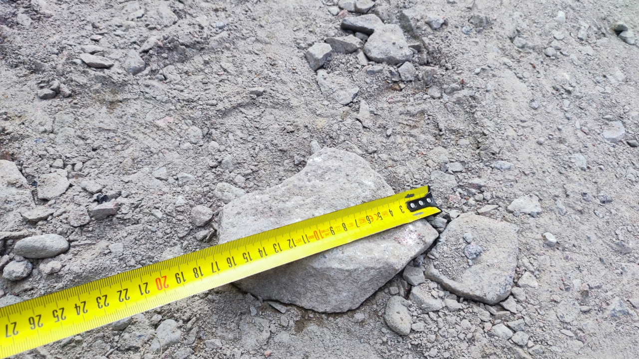 Крупный план строительной площадки: жёлтая рулетка разложена поверх большого камня, чтобы показать его размер и диаметр. Вокруг видны щебень разной фракции, пыльный песок и рыхлый грунт, отдельные камни лежат на фоне неровной подсыпки. Солнечный свет создаёт резкие тени, подчёркивает гранёную фактуру валуна и зернистость щебёночного слоя. Кадр наглядно иллюстрирует контроль материалов, отбор фракции и проверку качества подсыпки перед устройством основания. Фото подходит для публикаций о строительных материалах, дорожном ремонте и технологиях благоустройства.