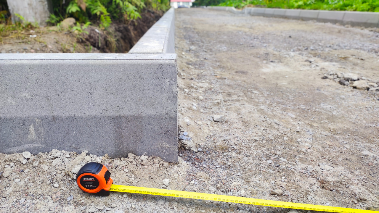Крупный план инструмента на объекте: корпус рулетки с маркировкой GIGANT лежит на щебне рядом с угловым стыком бордюрных камней. Лента вытянута вдоль кромки и показывает деления, используемые для контроля расстояний при укладке бордюра и подготовке основания. В кадре различимы камни, песчаная крошка и неровности подсыпки, подчёркивающие рабочую среду стройплощадки. Геометрия угла бордюра хорошо читается, что делает фото наглядным для тем про монтаж, замеры и контроль качества. Снимок подойдёт для материалов о строительных инструментах и благоустройстве территорий.