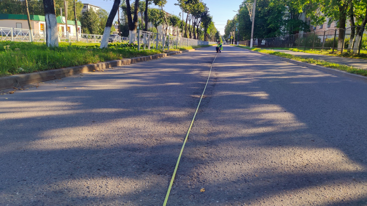 По центру асфальтовой улицы протянута длинная измерительная лента: в переднем плане видна катушка, дальше рулетка уходит по линии шва и заплаток к человеку, который присел и фиксирует точку замера. По сторонам дороги идут газоны, заборы и деревья, от кроны падают резкие тени. В перспективе заметны дорожные знаки и припаркованные машины, над улицей проходят провода. Поверхность покрытия неоднородная, с трещинами и следами ремонта, что подчёркивает цель обследования. Фото можно использовать для статей о диагностике дорог, измерениях на местности и подготовке к ремонту покрытия.