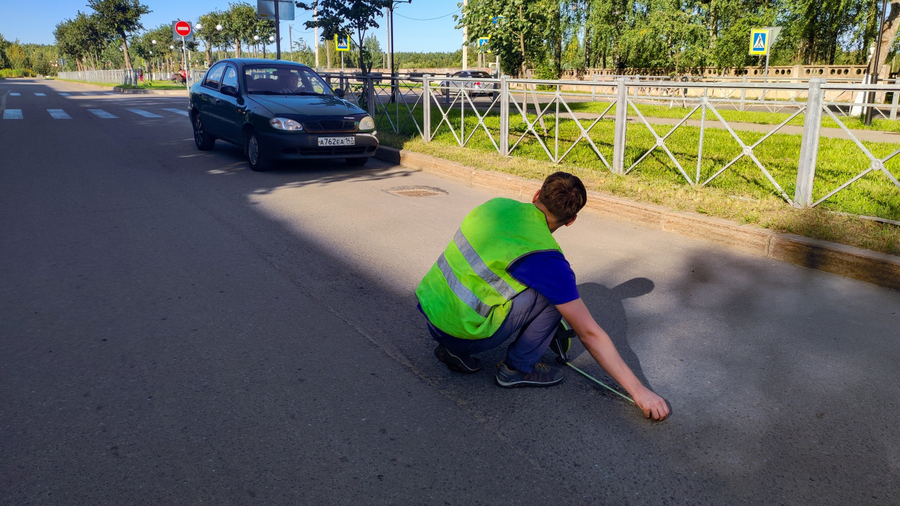 Дорожный замер у перекрёстка: рулетка, выбоина и рабочий в жилете