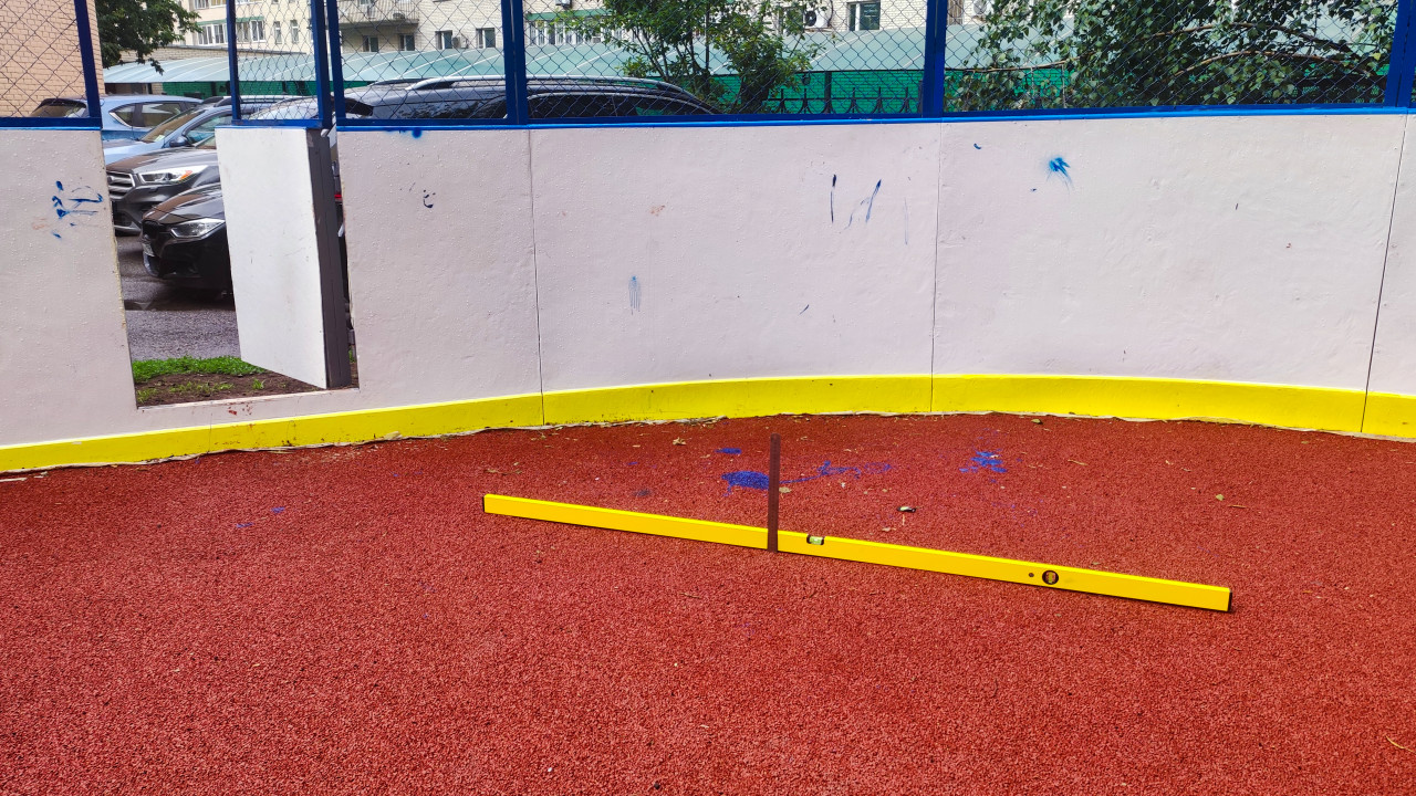 строительство строительный контроль контроль качества измерение замеры измерительный инструмент строительный уровень линейка проверка ровности перепад высот горизонталь ремонт благоустройство городская среда спортивная площадка дворовая территория резиновое покрытие покрытие из крошки уличный спорт ограждение сетка рабица борта площадки белые панели жёлтая разметка пузырьковый уровень металлическая линейка перепад приемка работ подрядчик эксплуатация безопасность спортивная инфраструктура жилой квартал парковкаПохожие фотографии