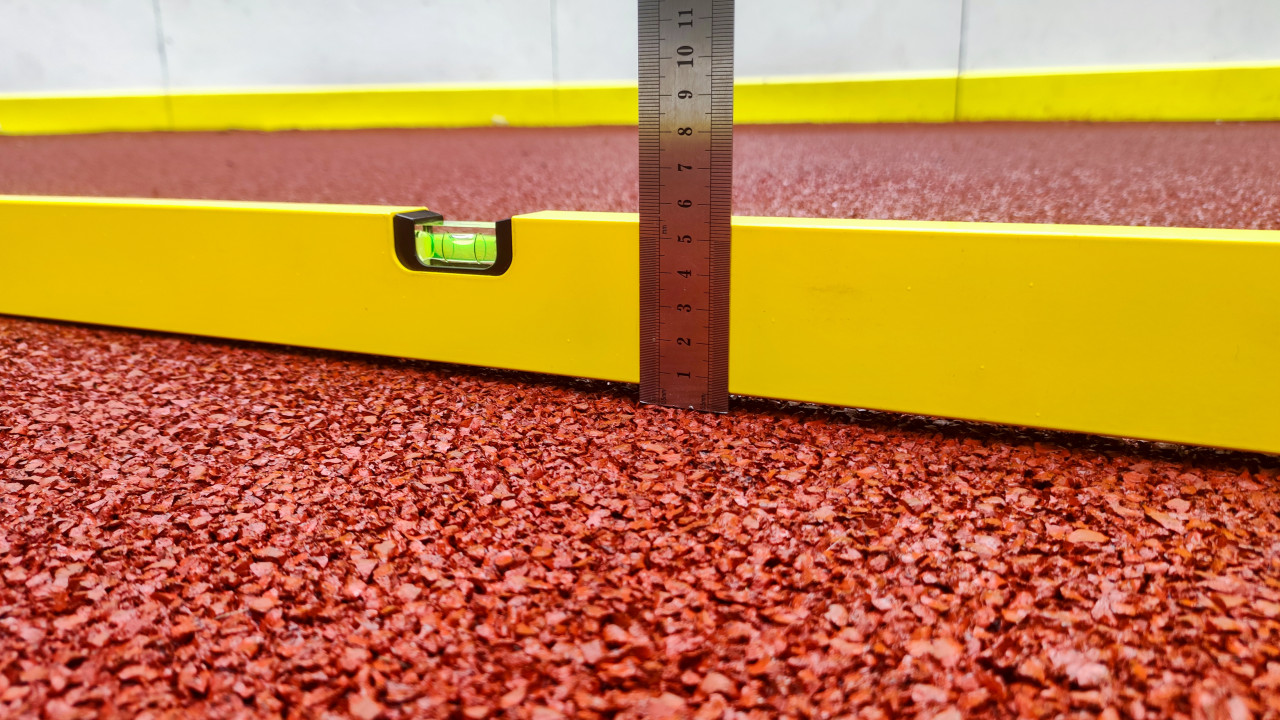 Измерение перепада высоты резинового покрытия с помощью уровня и металлической линейки