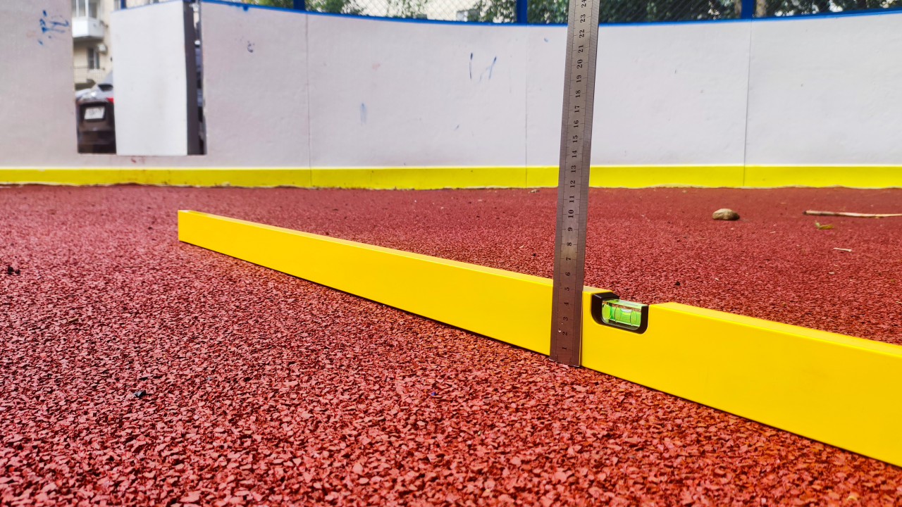 строительство строительный контроль контроль качества измерение замеры измерительный инструмент строительный уровень линейка проверка ровности перепад высот горизонталь инструменты строительные замеры перепад приёмка работ ремонт обслуживание спортивная площадка уличная площадка двор резиновое покрытие резиновая крошка фактура покрытия ограждение борта сетка следы краски износ безопасность благоустройство городской двор монтаж строительные работыПохожие фотографии