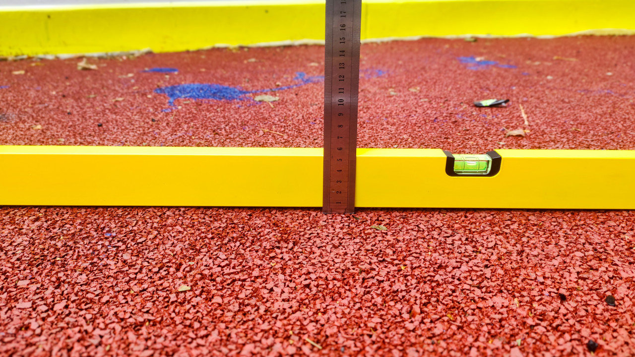 На фото показан инструментальный контроль уличного покрытия: жёлтый уровень расположен на красной поверхности из резиновой крошки, к нему приставлена металлическая линейка. Считывая отметки, можно оценить толщину слоя и перепады, а ампула уровня помогает проверить ровность. На фоне виден жёлтый защитный борт у стены, мелкие листья и пятна краски на настиле. Снимок отражает типовую процедуру приемки спортивных площадок после ремонта или укладки нового покрытия. Подходит для материалов о строительных измерениях, технадзоре и эксплуатации спортобъектов.