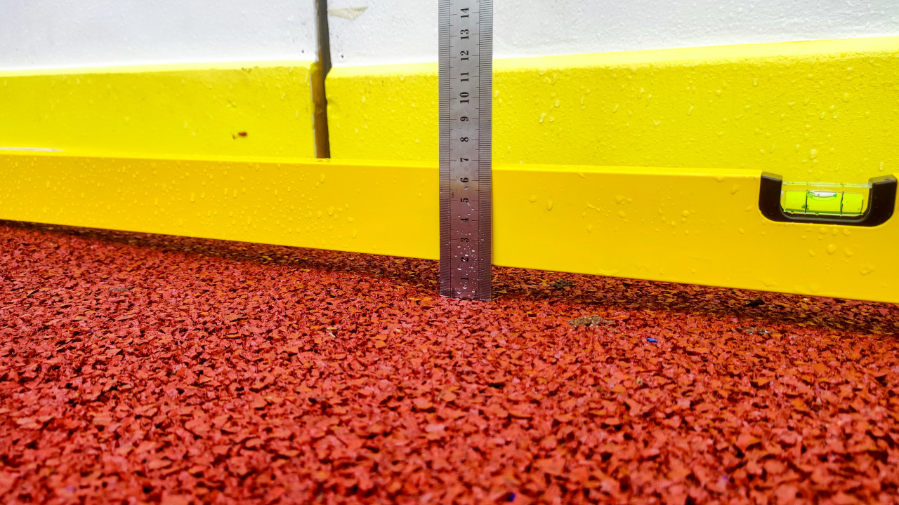 строительство строительный контроль контроль качества измерение замеры измерительный инструмент строительный уровень линейка проверка ровности перепад высот горизонталь ремонт технадзор строительный инструмент металлическая линейка пузырьковый уровень крупный план макросъемка резиновое покрытие резиновая крошка текстура зазор неровность просадка капли воды влажная поверхность борта желтый отбойник стык панели дефект обследование отчет уличная площадкаПохожие фотографии