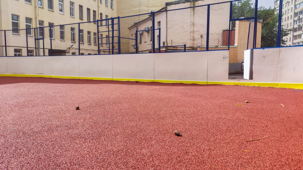 строительство благоустройство городская среда общественное пространство покрытие уличное покрытие резиновое покрытие резиновая крошка поверхность фактура текстура красное покрытие спортивная площадка двор город обслуживание уборка мусор листья грязь следы дождя эксплуатация калитка ограждение сетка борта желтая полоса качество работ контроль коммунальное хозяйство управляющая компания ремонт инфраструктура дворовая территорияПохожие фотографии