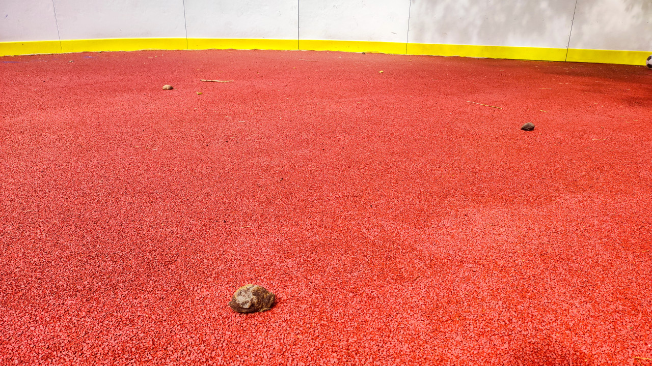 строительство благоустройство городская среда общественное пространство покрытие уличное покрытие резиновое покрытие резиновая крошка поверхность фактура текстура спорт спортивная площадка уличная площадка красная поверхность борт желтая кромка износ загрязнение мусор камни мелкий щебень веточки листья безопасность риск падения профилактика травм уборка обслуживание коммунальные услуги дворовая инфраструктура городской двор контроль качества эксплуатацияПохожие фотографии
