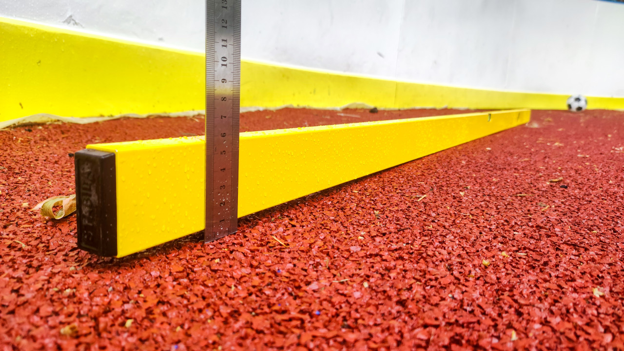 Низкий ракурс на измерения на спортивной площадке: на красном резиновом покрытии стоит металлическая линейка с делениями, рядом лежит желтая измерительная рейка, используемая для контроля перепадов высоты и ровности слоя. На рейке заметны капли влаги, на поверхности крошки видны песчинки и мелкие частицы, а на заднем плане размыто читаются элементы борта и мяч, что связывает замеры с эксплуатацией площадки. Кадр подходит для материалов о строительных обследованиях, приемке работ, ремонте покрытий и техническом контроле благоустройства.