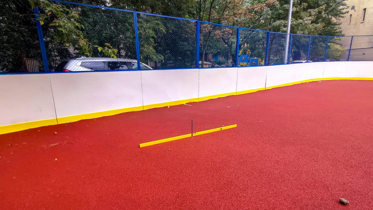 строительство строительный контроль контроль качества измерение замеры измерительный инструмент строительный уровень линейка проверка ровности перепад высот горизонталь спорт город двор уличная площадка спортивная коробка хоккейный корт закругленный угол резиновое покрытие резиновая крошка белые борта желтый отбойник сетчатое ограждение синий каркас контрольная рейка измерение уклона приемка объекта благоустройство двора жилой дом уличный фонарь деревья осень эксплуатация ремонт инфраструктураПохожие фотографии