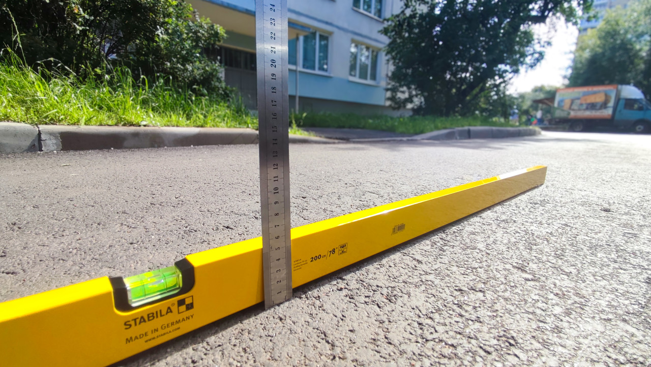 Измерение перепада высот на асфальте с помощью уровня и металлической линейки