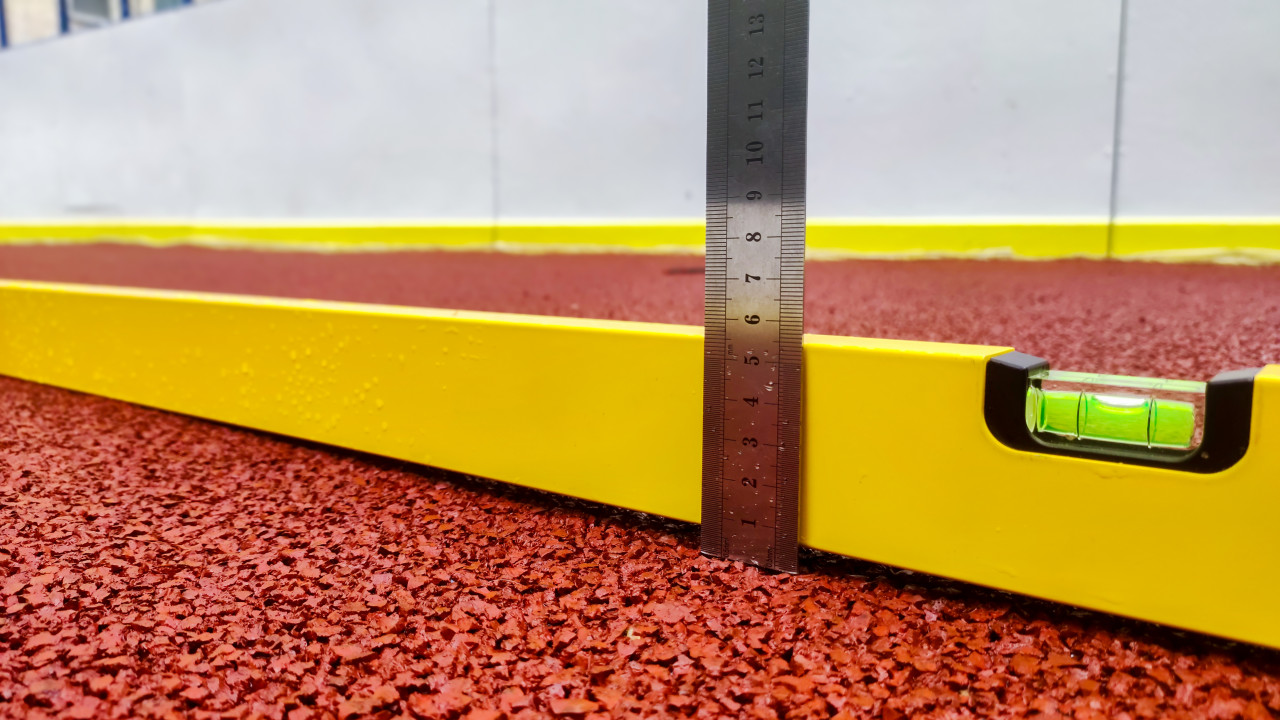 строительство строительный контроль контроль качества измерение замеры измерительный инструмент строительный уровень линейка проверка ровности перепад высот горизонталь обследование измерения проверка замер инструмент ровность толщина слоя резиновое покрытие резиновая крошка гранулы фактура текстура мокрое покрытие капли воды спортивная площадка благоустройство ремонт приёмка работ технадзор эксплуатация уличная инфраструктура диагностика покрытияПохожие фотографии