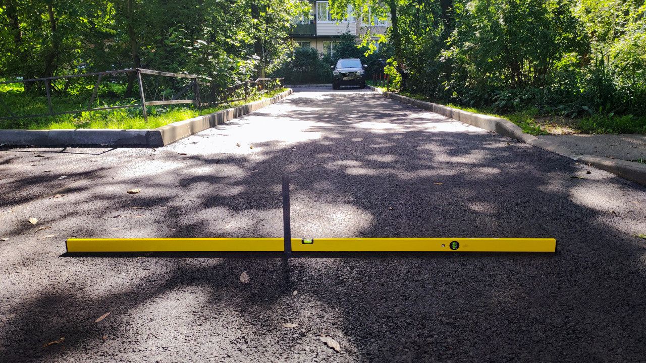 строительство строительный контроль контроль качества измерение замеры измерительный инструмент строительный уровень линейка проверка ровности перепад высот горизонталь город двор дворовой проезд ремонт двора дорожные работы асфальт асфальтовое покрытие благоустройство технический надзор приемка асфальта контроль перепада измерение уклона измерительная линейка контрольная рейка бордюр поребрик металлическое ограждение газон деревья тени деревьев припаркованный автомобиль листья дневной свет жилой домПохожие фотографии