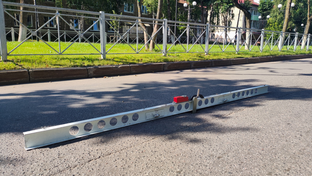 Длинная измерительная рейка лежит на дороге рядом с ограждением и зелёной полосой