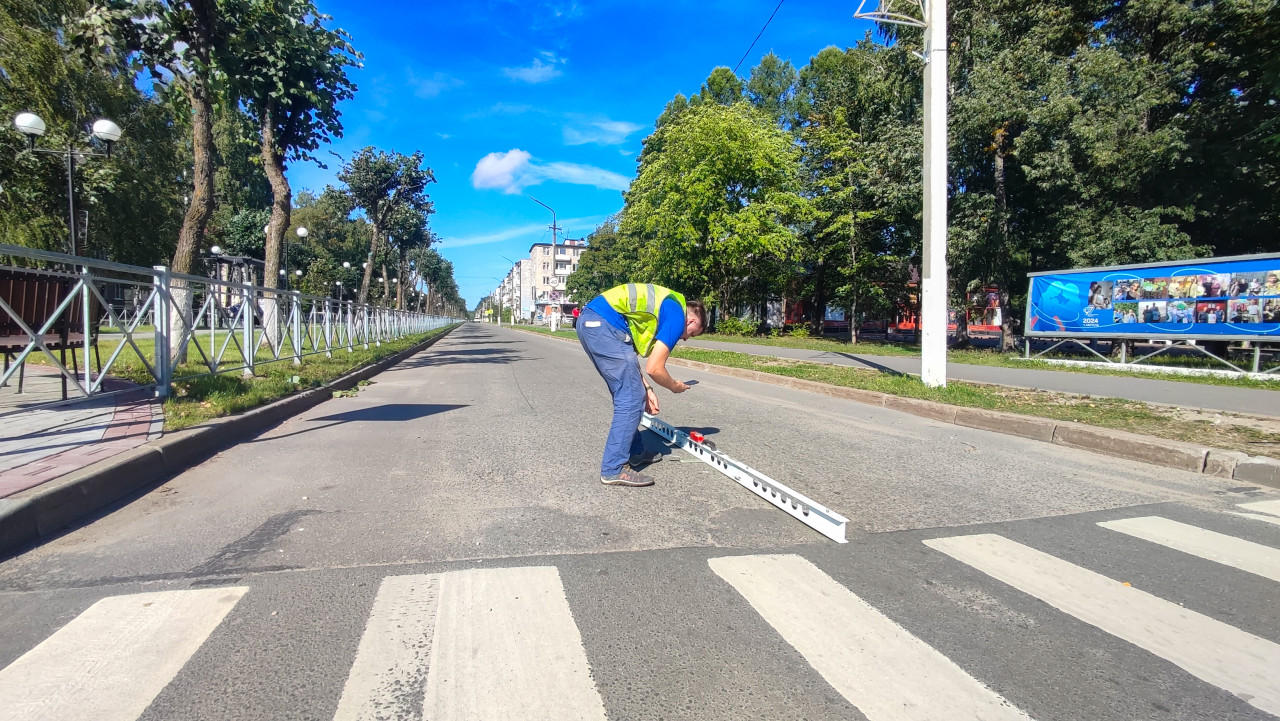 строительство дорога асфальт дорожное покрытие измерение замеры контроль качества технический контроль строительный контроль технадзор диагностика неровности рейка дороги дорожные работы замер продольная ровность неровности покрытия пешеходный переход зебра безопасность движения рейка измерительная контрольная рейка клин промерник измерение просвета ГОСТ ГОСТ Р 56925 2016 рабочий сигнальный жилет городская улица ограждение деревья рекламный щит дневной светПохожие фотографии