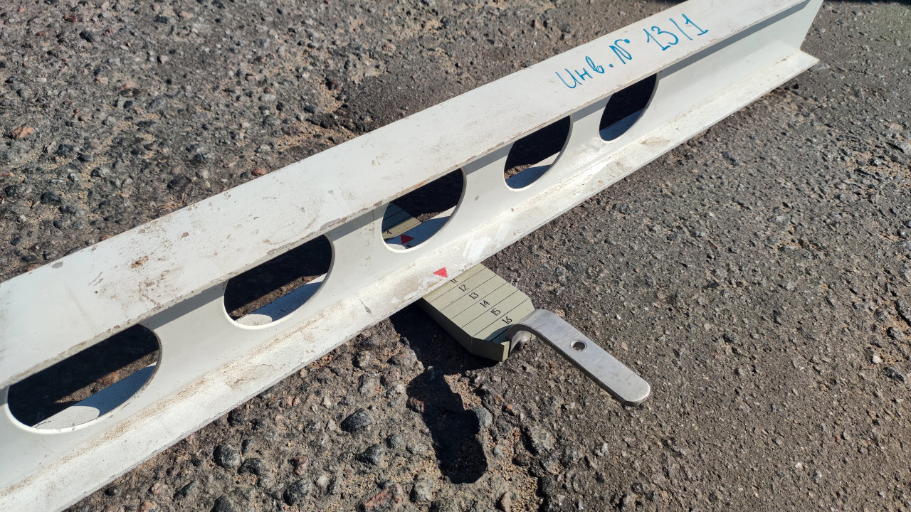 Очень близко снят клин-промерник с делениями: он вставлен под измерительную рейку с круглыми отверстиями, чтобы определить величину просвета. Сверху на рейке заметна рукописная надпись и потёртости, снизу виден грубый, зернистый асфальт и тень от инструмента. Такая связка «рейка + клин» используется для измерения продольной ровности дорожного покрытия по ГОСТ Р 56925-2016. Фото подойдёт для обучающих материалов, техотчётов, статей о контроле качества и ремонте дорог. Из-за ракурса отлично читается форма клина и то, как он упирается в покрытие, а рядом виден край трещинки и мелкий камень в структуре асфальта.