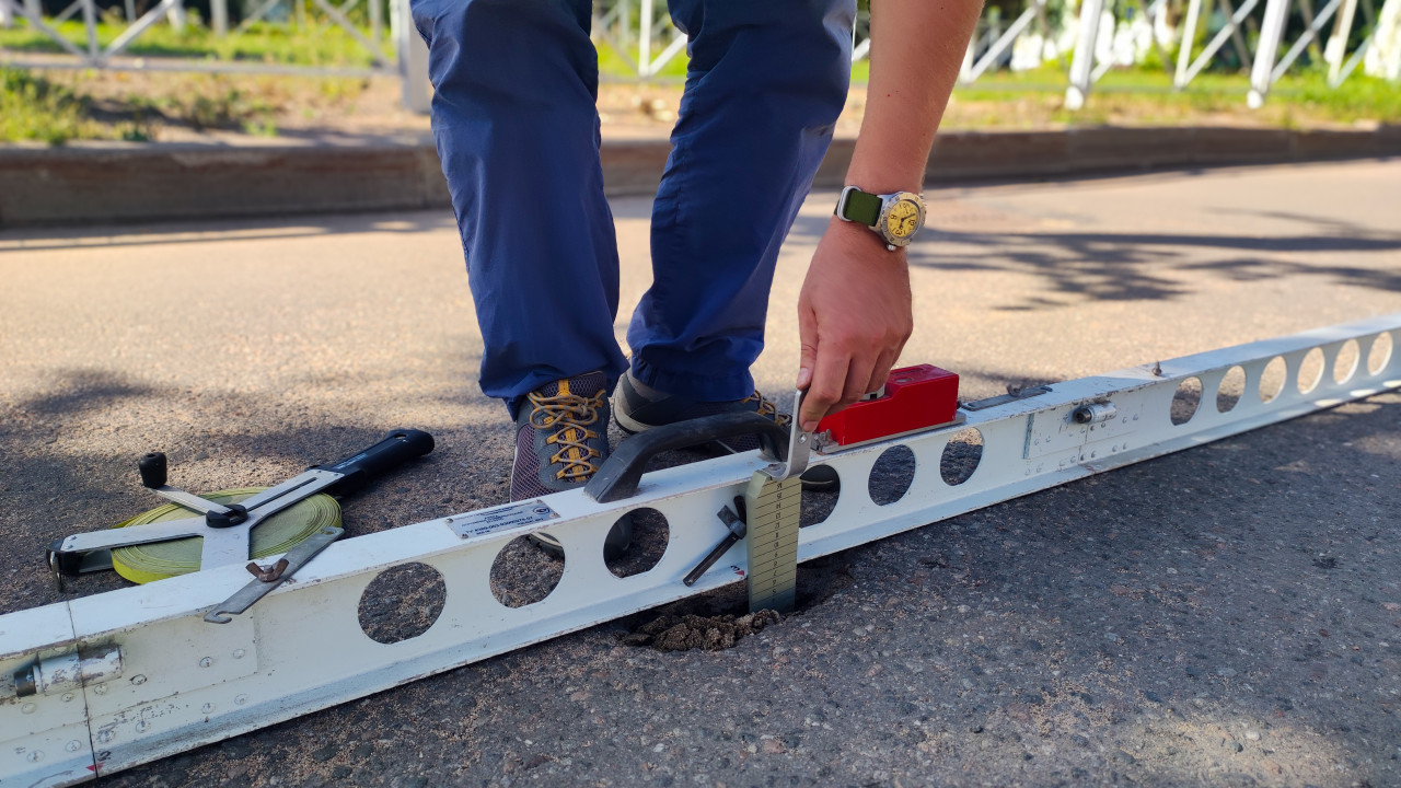 строительство дорога асфальт дорожное покрытие измерение замеры контроль качества технический контроль строительный контроль технадзор диагностика неровности рейка крупный план дорожная рейка клин промерник измерение неровностей продольная ровность просвет под рейкой рулетка измерительная лента инструмент дорожная диагностика ГОСТ Р 56925 2016 дорожные работы обследование методика измерений приёмка работ безопасность тени дневной свет фактура асфальта ремонт дорог проверкаПохожие фотографии