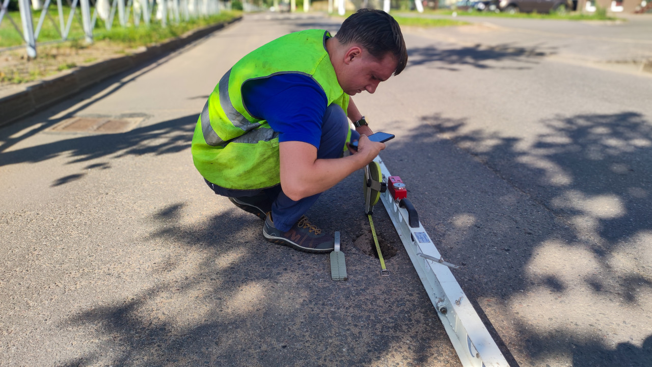 строительство дорога асфальт дорожное покрытие измерение замеры контроль качества технический контроль строительный контроль технадзор диагностика неровности рейка рабочий сигнальный жилет дорожные измерения дорожная рейка клин промерник продольная ровность измерение просвета ГОСТ Р 56925 2016 рулетка измерительная лента инструмент обследование дорог приёмка работ дорожные работы ремонт дорог тени дневной свет городская улицаПохожие фотографии
