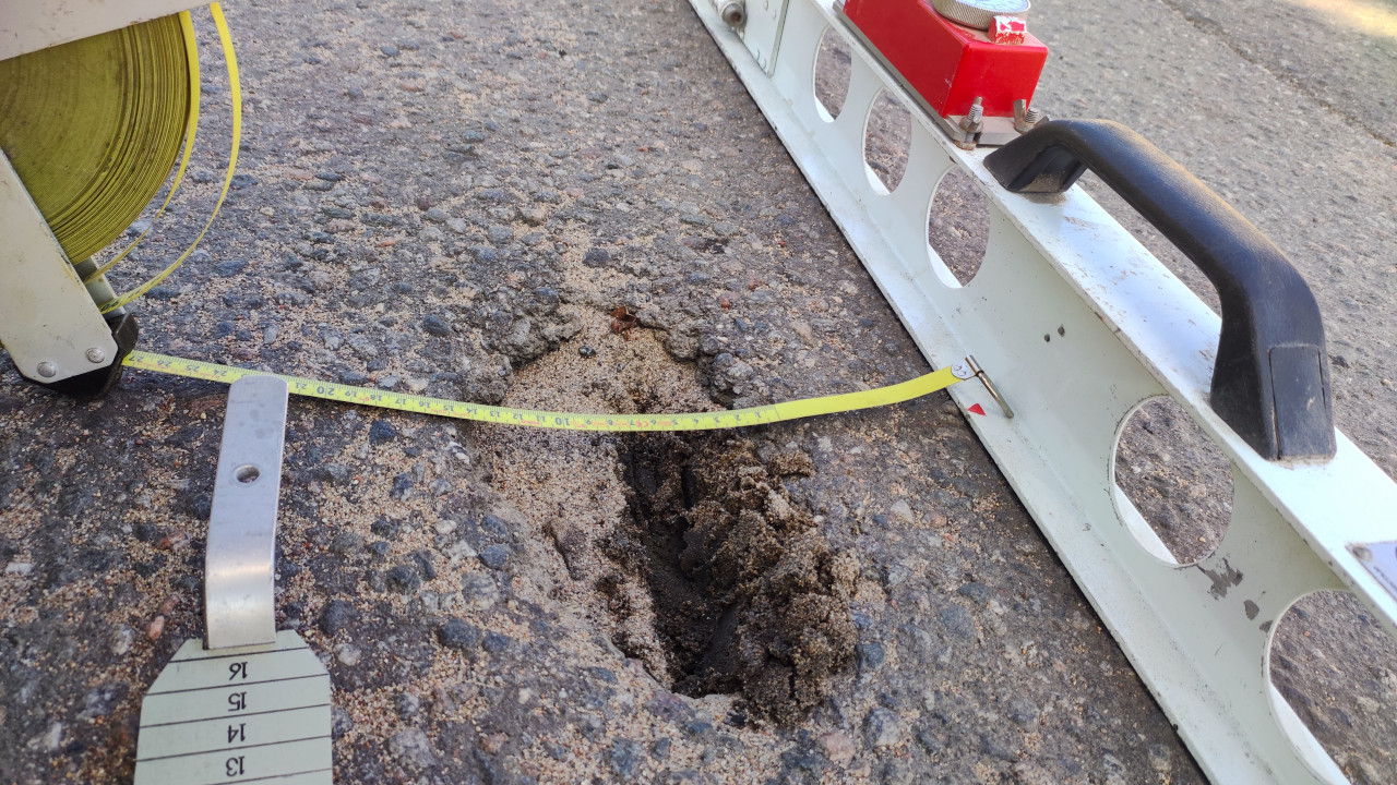 Яма в асфальте и замер рулеткой под рейкой, чтобы зафиксировать дефект покрытия