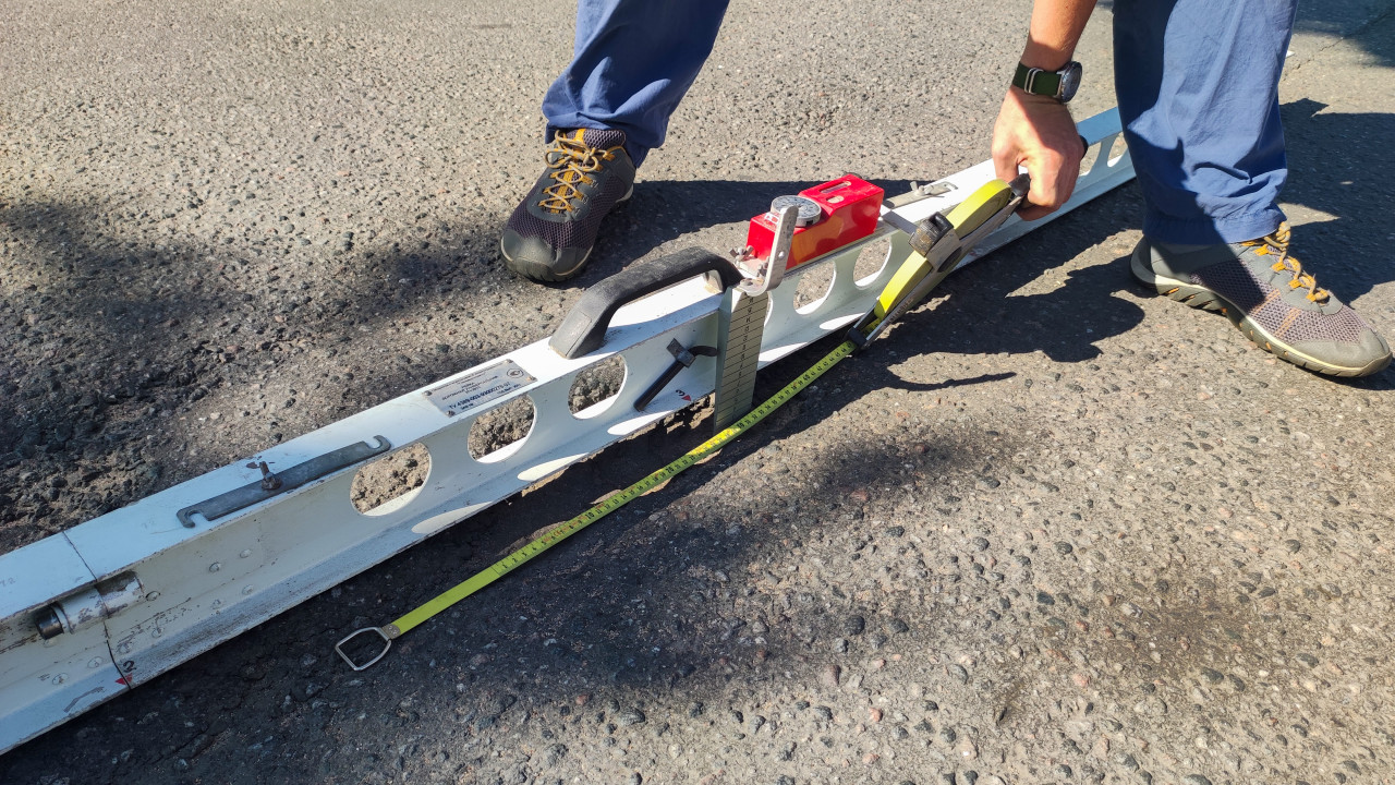 строительство дорога асфальт дорожное покрытие измерение замеры контроль качества технический контроль строительный контроль технадзор диагностика неровности рейка продольная ровность неровность клин промерник ГОСТ Р 56925 2016 уровень рулетка измерительная лента длина дефекта экспертиза дефекты дороги просадка колея перепад высоты акт осмотра фото для отчёта ремонт дорог дорожные работы городская инфраструктура износ покрытия ограждение бордюр газонПохожие фотографии