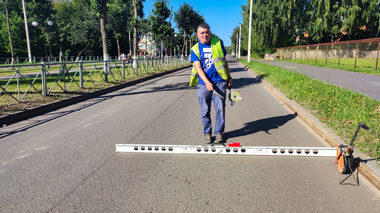 строительство дорога асфальт дорожное покрытие измерение замеры контроль качества технический контроль строительный контроль технадзор диагностика неровности рейка геодезия измерения обследование технический надзор дефект яма выбоина асфальтобетон контрольная рейка клиновой щуп рулетка измерительная лента мерное колесо измерительное колесо инструменты спецодежда сигнальный жилет инженер рабочий полевые работы бордюр газон фонари дорожные знакиПохожие фотографии