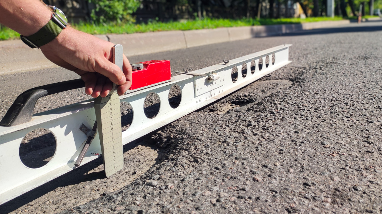 строительство дорога асфальт дорожное покрытие измерение замеры контроль качества технический контроль строительный контроль технадзор диагностика неровности рейка крупный план просвет замер рейка измерительная контрольная рейка клин промерник измерение просвета продольная ровность ГОСТ ГОСТ Р 56925 2016 инструменты рука песок щебень текстура асфальта дорожная разметка зебра дорожные работы приёмка техотчётПохожие фотографии