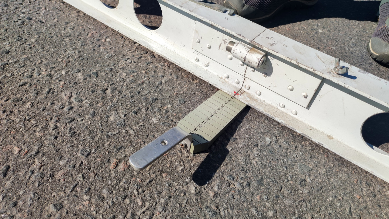Дорожная измерительная рейка с клиновым щупом на асфальте крупным планом