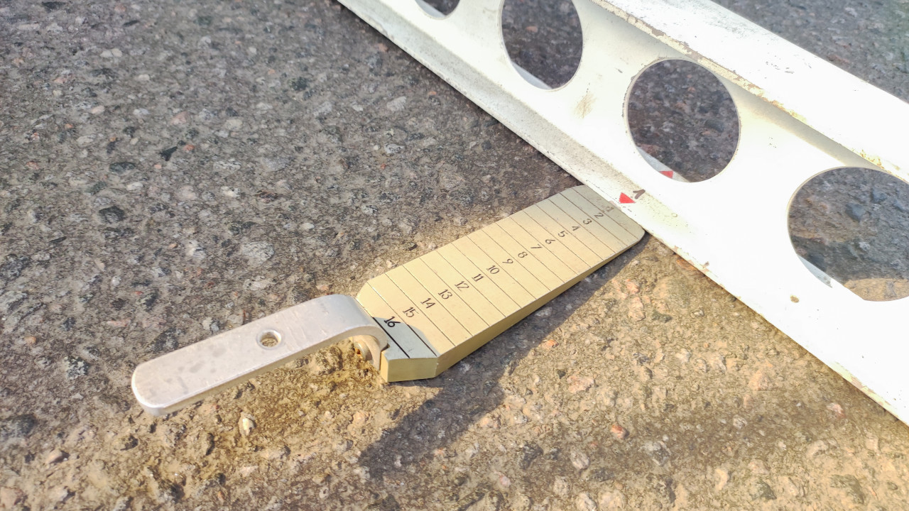 Металлический клиновой щуп под рейкой фиксирует величину зазора на неровном асфальте