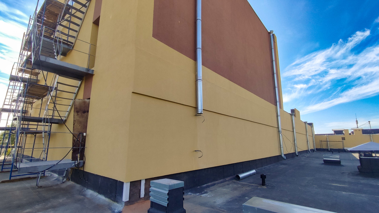 Снято на плоской кровле: видна широкая поверхность рулонной гидроизоляции с швами, парапет и несколько вентиляционных выходов. Слева установлены строительные леса и металлические площадки, у стены проходят вертикальные трубы и кабели. Фасад окрашен в жёлтые и коричневые плоскости, у основания заметен чёрный цоколь. В кадре присутствует кровельное оборудование и участок неба с облаками, что указывает на ясную погоду. Фото подходит для тем о кровельных работах, обслуживании инженерных систем и технике безопасности на высоте.