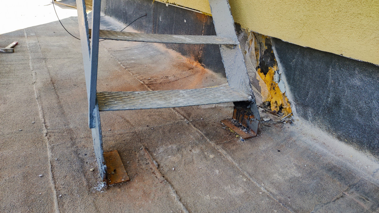 На фотографии показана металлическая лестница в боковом ракурсе: две ступени из рифлёной стали, стойки и опорные пластины, закреплённые на плоской кровле с рулонным покрытием. На элементах конструкции заметны потёки краски, ржавчина и следы эксплуатации. У стены виден участок повреждённого фасада: отслоившаяся штукатурка, открытая армирующая сетка, монтажная пена и загрязнения у цоколя. По поверхности кровли проходят швы и пятна пыли. Съёмка выполнена на крыше при естественном освещении. Фото пригодится для тем о дефектах отделки, ремонте фасадов и обслуживании многоквартирных зданий.