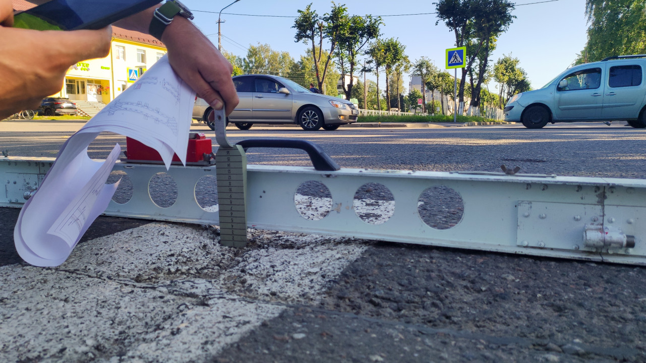 Клин-щуп и металлическая рейка измеряют перепад на асфальте рядом с полосой разметки