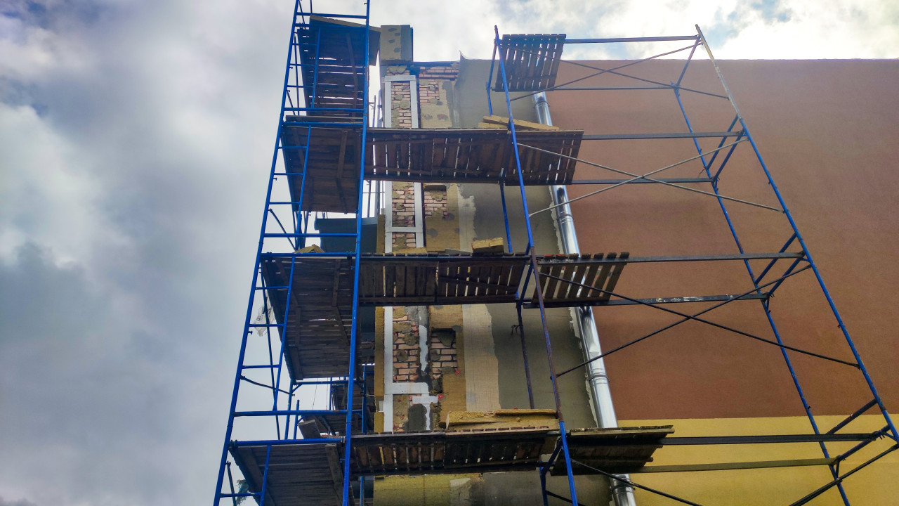 строительство ремонт здание фасад строительные работы обслуживание зданий техническое состояние строительные конструкции металлоконструкции отделка фасада ремонт зданий фасадные работы строительные леса рабочая площадка настил крепеж соединения металлоконструкция водосток водосточная труба окна старая штукатурка очищение фасада подготовка под ремонт кирпич повреждения потеки следы краски капитальный ремонт высотные работы безопасность реконструкция ремонт наружных стен обследование ремонтный участок городская среда крупный планПохожие фотографии