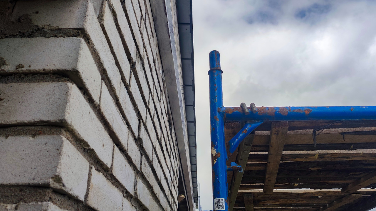 Строительные леса у кирпичной стены и свес крыши на фоне облачного неба