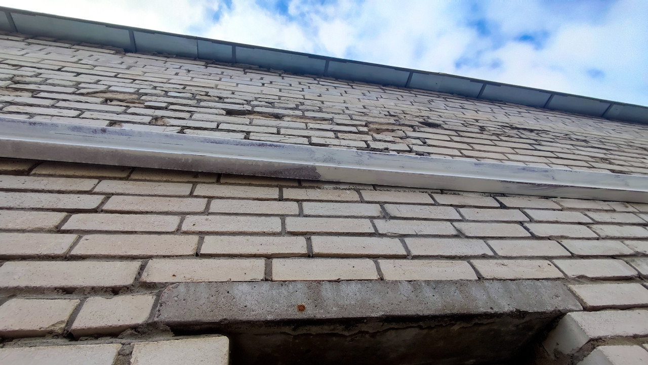Вид снизу на кирпичную стену и металлический карниз: под выступом заметны крепежные элементы, стык металла и кладки, а также мелкие трещины и потемнения на поверхности. В кадре читается край проема или ниши с металлической деталью, что подчеркивает архитектурный узел и работу водоотвода. Пасмурное небо дает ровное освещение, хорошо видна фактура кирпича и состояние швов. Фотография подойдет для материалов об архитектурных деталях, обследовании фасадов, ремонте карнизов и кровельных примыканий, а также для техотчетов и презентаций подрядчиков.
