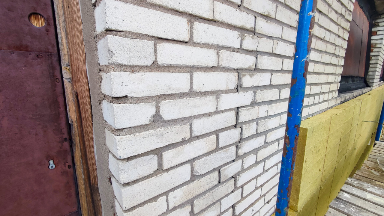 Кирпичный фасад на строительных лесах и плиты минеральной ваты для утепления
