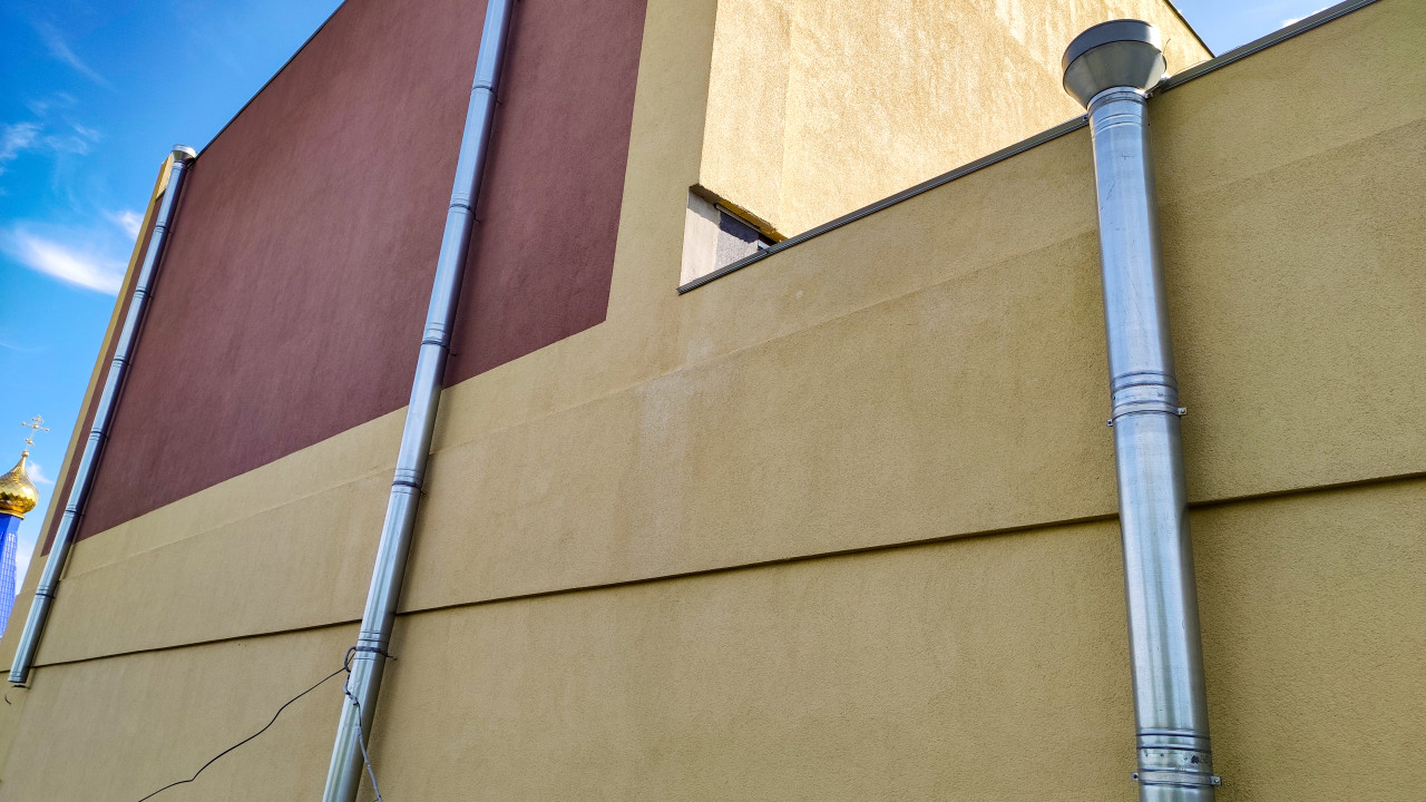 Фрагмент фасада здания с комбинированной отделкой: жёлтая штукатурка и тёмно-коричневая вставка, разделённые горизонтальным швом. По стене проходит высокая оцинкованная водосточная труба с коленом и хомутами крепления; рядом видны кабельные вводы и стыки панелей. Сверху читается край парапета и небольшой световой проём под кровлей. На фоне яркого неба заметен блеск позолоченного купола и крест на дальнем плане. Снимок пригодится для материалов о городских фасадах, водосточных системах и инженерных коммуникациях.