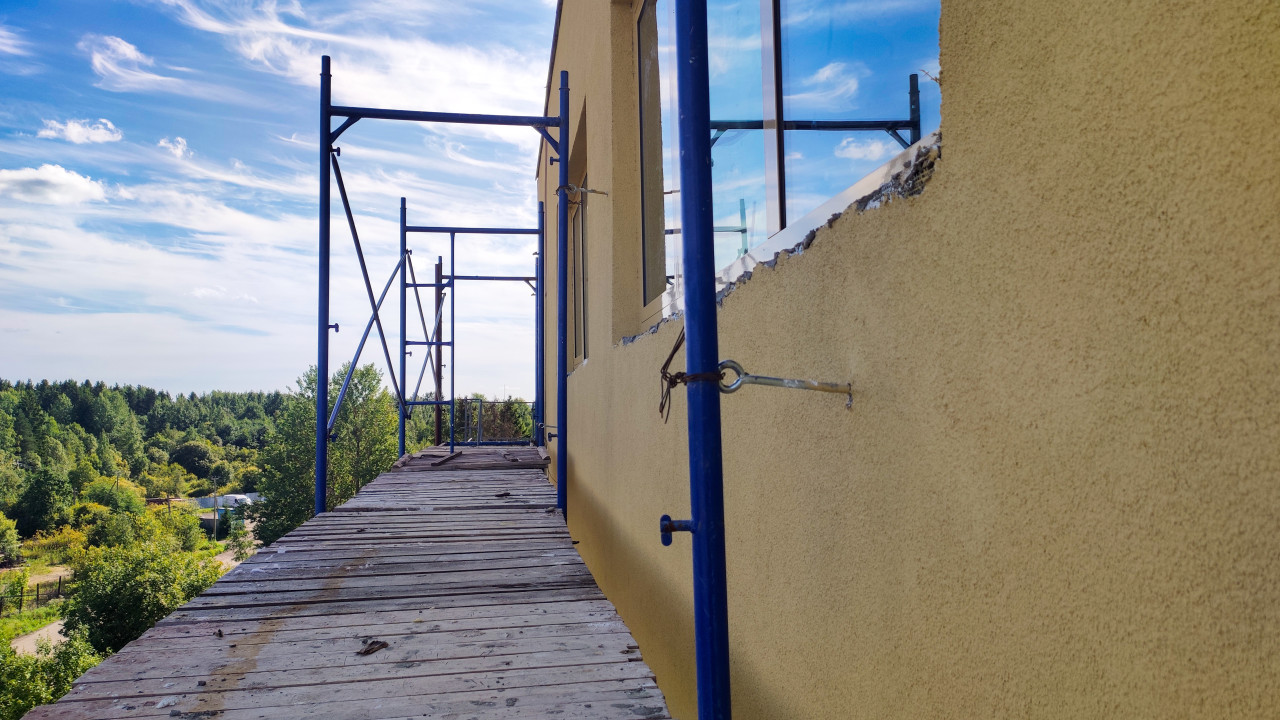строительство ремонт здание фасад строительные работы обслуживание зданий техническое состояние строительные конструкции металлоконструкции отделка фасада ремонт зданий строительные леса фасадные работы реконструкция настил деревянный настил доски металлические стойки синий каркас диагональные связи ограждение высота высотные работы доступ к фасаду крепеж штукатурка повреждение отделки техническое обслуживание капремонт загородный объект деревья лесной пейзаж зелень небо облака перспектива строительная площадкаПохожие фотографии