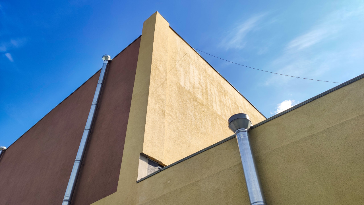 Угол многоэтажного здания, снятый снизу вверх: жёлтый фасад с ровной штукатуркой, тёмно-коричневая вертикальная вставка и выступающий парапет. Вдоль стены закреплена водосточная труба, а рядом поднимается вентиляционный стояк с металлическим колпаком. В верхней части заметен треугольный проём и линии примыканий, по небу тянется тонкий провод. Сильный солнечный свет делает фактуру штукатурки и стыки отделки более заметными на фоне чистого голубого неба. Подходит для иллюстраций про архитектурные детали, вентиляцию и обслуживание инженерных систем.