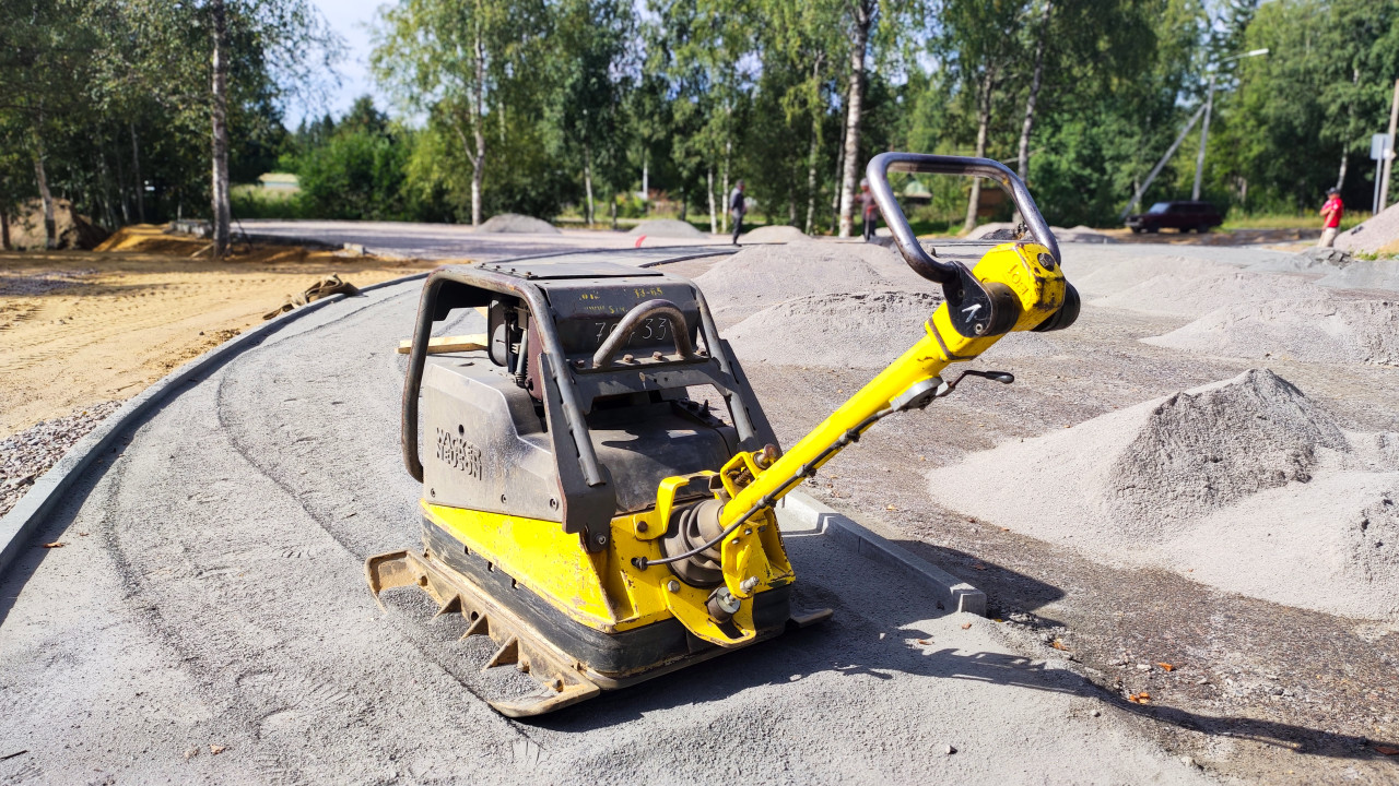 строительство дорожные работы виброплита виброплита для уплотнения уплотнение грунта уплотнение песка строительный инструмент оборудование ремонт дорог подготовка основания песок основание бордюр бетонный бордюр инертные материалы щебень следы шин стройплощадка благоустройство укладка плитки тротуар пешеходная зона городская среда деревья рабочие техника строительные технологии летоПохожие фотографии
