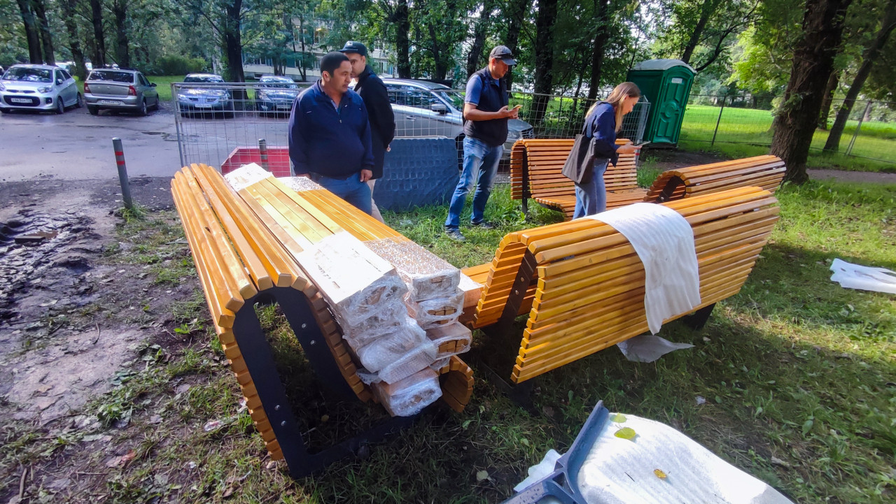 строительство благоустройство строительная площадка строительные работы строительные материалы поставка логистика складирование упаковка инфраструктура уличная мебель скамейка парковые скамейки новые скамейки деревянные рейки дерево лак металлический каркас мебель для улицы установка монтаж подготовка защитная пленка газон трава деревья парк общественное пространство рабочие городская среда ограждение стройплощадка парковка автомобили коммунальные работы улучшение территорииПохожие фотографии