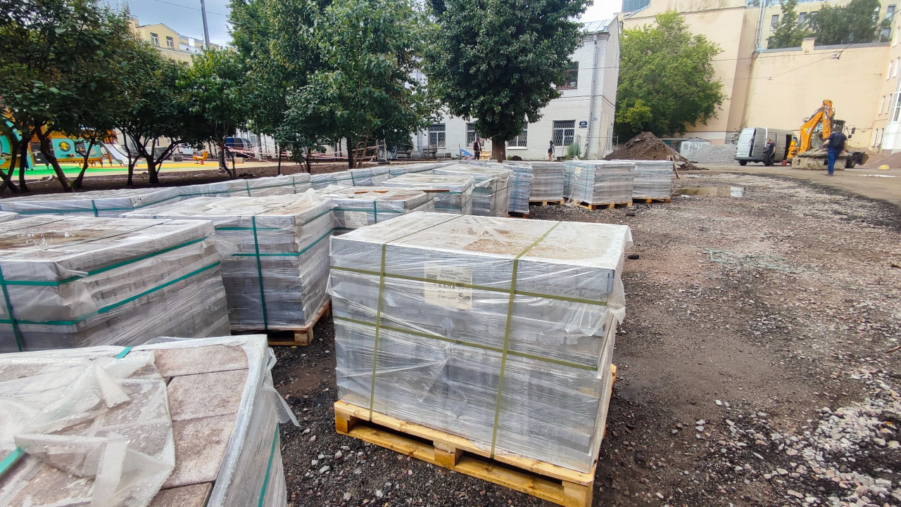 строительство благоустройство строительная площадка строительные работы строительные материалы поставка логистика складирование упаковка ремонт двора паллеты тротуарная плитка доставка фургон временное ограждение безопасность техника спецтехника рабочая зона подготовка основания асфальт лужи влажная поверхность городская среда двор газон деревья укладка покрытия дорожные работы организация работ инфраструктура коммунальные работыПохожие фотографии
