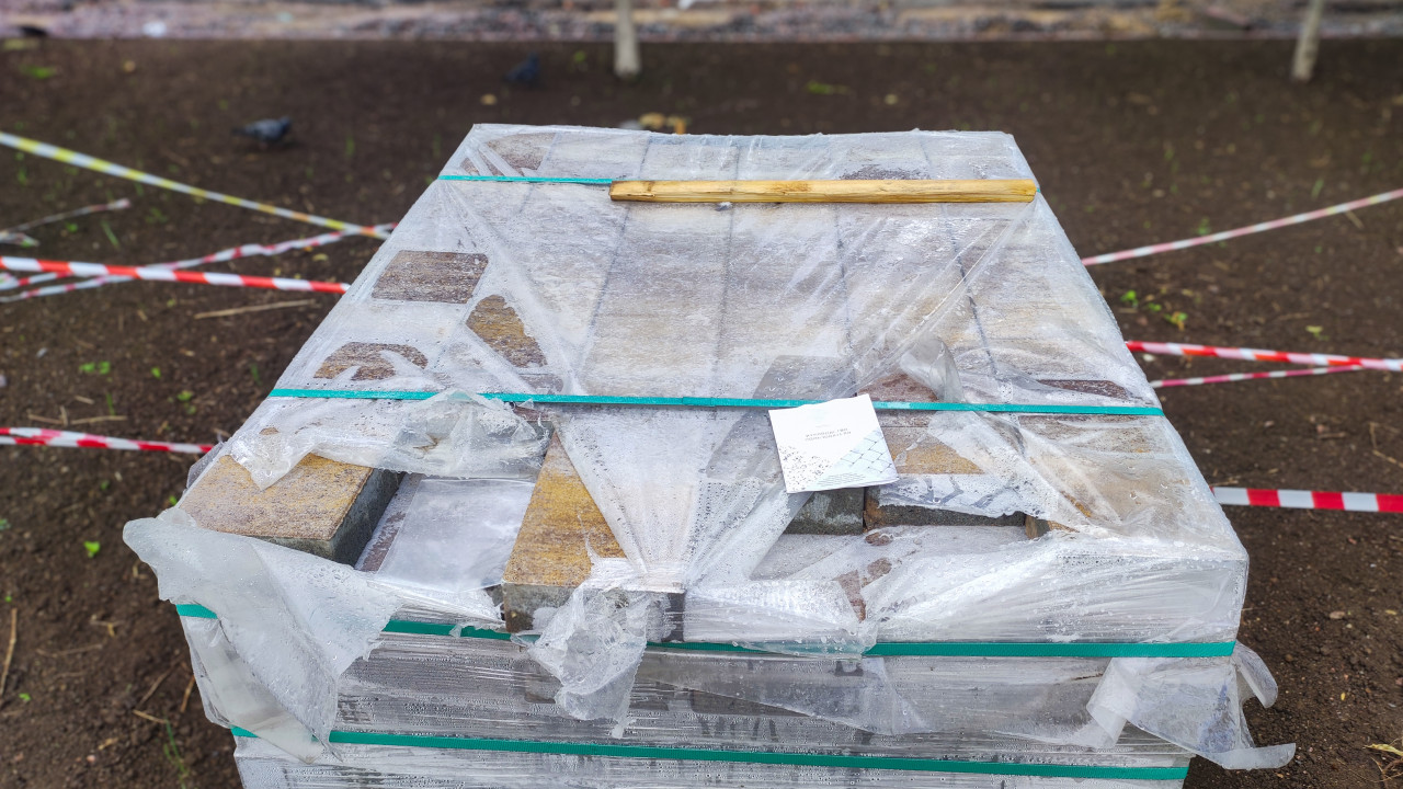 строительство благоустройство строительная площадка строительные работы строительные материалы поставка логистика складирование упаковка стройматериалы тротуарная плитка бордюр бетонные изделия поддон паллет упаковочная плёнка зелёные ремни стяжные ленты бирка маркировка хранение материалов склад доставка ремонт территории дворовые работы подготовка мощения укладка плитки земля ограждение сигнальная лента крупный планПохожие фотографии