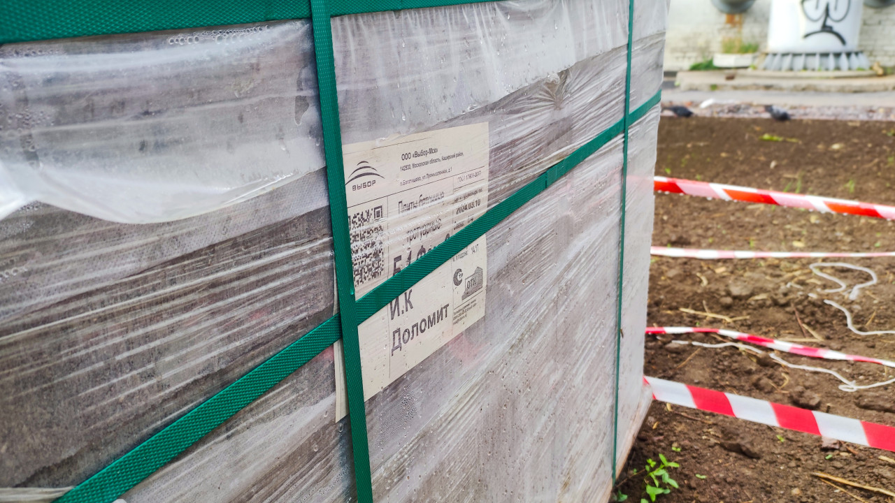 строительство благоустройство строительная площадка строительные работы строительные материалы поставка логистика складирование упаковка стройматериалы тротуарная плитка бетонные изделия поддон паллет упаковочная плёнка зелёные ремни стяжка этикетка маркировка QR код товарная наклейка учёт материалов доставка ремонт территории сигнальная лента грунт серия Доломит бренд Выбор контроль качества крупный планПохожие фотографии