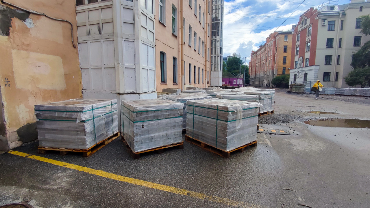 строительство благоустройство строительная площадка строительные работы строительные материалы поставка логистика складирование упаковка тротуарная плитка паллеты поддоны пленка доставка ремонт двора укладка плитки подготовка работ мокрый асфальт лужи разметка городская среда жилые дома двор проезжая часть пешеходы инфраструктура организация работ дорожные работы ремонт тротуара коммунальные работы хранение материаловПохожие фотографии