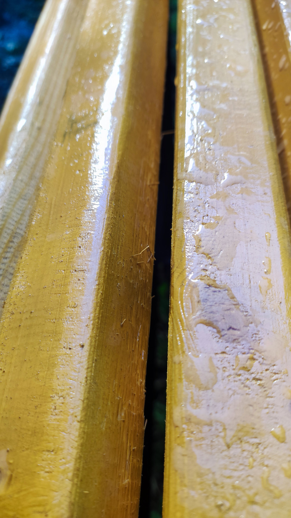Вертикальный крупный план показывает две параллельные деревянные рейки уличной скамейки, покрытые лаком и влажные после дождя. На поверхности заметны округлые капли и тонкие потёки воды, бликующие в дневном свете, а также мелкие царапины и небольшие неровности древесины. Между рейками проходит узкий зазор, в глубине просматривается тёмно-зелёный фон, создающий контраст с тёплым оттенком дерева. Снимок подчёркивает фактуру материала и атмосферу после осадков. Фото можно использовать как текстуру или фон, а также в материалах о погоде, городской среде и уличной мебели.